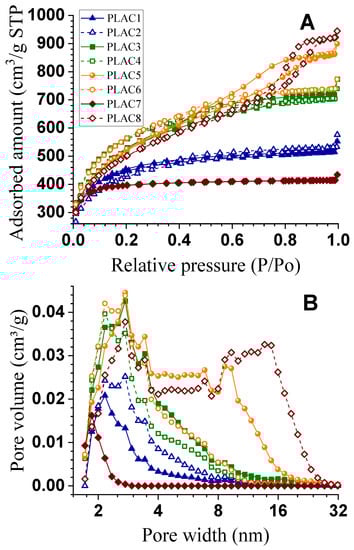N2 adsorption-desorption studies of AC samples from poplar AHL prepared under different activation temperatures, times, and impregnation ratios using H3PO4, as listed in Table 1, were carried out and the results are shown in Figure 2A. According to the IUPAC classification, the N2 adsorption-desorption isotherms of AHL-AC7 belonged to type I, indicating AHL-AC7 primarily contains micropores. The isotherms of AHL-AC5 and AHL-AC8 belonged to type IV with hysteresis loops, indicating the two ACs contain primary mesopores. The isotherms of AHL-AC1, -AC2, -AC3, -AC4, and -AC6 are a mixture of type I and type IV with hysteresis loops, indicating the co-existence of micropores and mesopores in these ACs. In the low-pressure region where P/Po ≤ 0.1, N2 uptake was obvious with rapid increase in adsorption capacity with increasing pressure, an adsorption characteristic of materials with micropores. In the high-pressure region, hysteresis loops were present due to the capillary condensation of adsorbate in slit-shaped mesopores in ACs [27]. AHL-AC5 and -AC8 exhibit the highest adsorption capacity among all the samples examined. AHL-AC6 has excellent adsorption capacity in the low and middle pressure regions, suggesting the existence of well-developed micropores and small mesopores. AHL-AC5 and -AC8, however, have greater absorption capacity in the high-pressure region than other ACs, indicating the presence of considerable larger mesopores, and the multi-molecular layer adsorption in the larger mesopores.