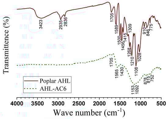 FT-IR spectra of acid hydrotropic lignin (AHL) and AHL-AC6.