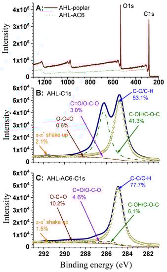 The XPS spectra of poplar AHL and AHL-AC6 show two major peaks ascribed to C1s and O1s photoelectrons (Figure 4A). S in AHL-AC6 was enriched due to the loss of elemental oxygen through carbonization. The surface elemental composition based on XPS measurements (Table 3) indicate AHL has only 0.22% S from the residual p-TsOH in the sample and H2SO4 used for impregnation. The presence of P is from the H3PO4 used for impregnation. Carbonization substantially reduced elemental oxygen from 25.1% to 8.5% to result in enriched carbon content of 90.4% from 70.6%.