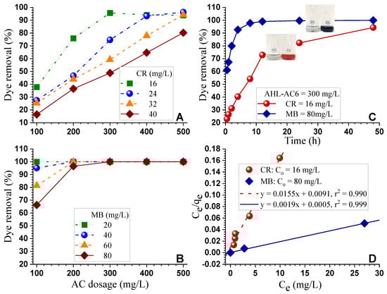 Dye adsorption by AHL-AC6. Dye congo red (CR) (A) and methylene blue (MB) (B) removal capacity after 48 h adsorption. At AC dosage of 300 mg/L dye solution, dye removal with respect to absorption duration (C) and adsorption isothermal fit to Langmuir model (D).