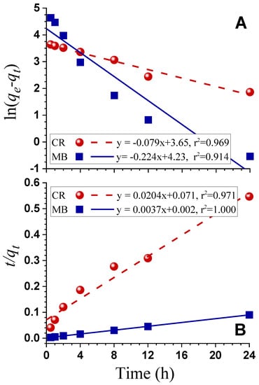 AHL-AC6 kinetic dye adsorption data fitted to models. (A): Pseudo-first order model; (B): Pseudo-second order model. Initial dye concentrations: CR Co = 16 mg/L; MB Co = 80 mg/L. Amount of AHL-AC applied = 300 mg/L.