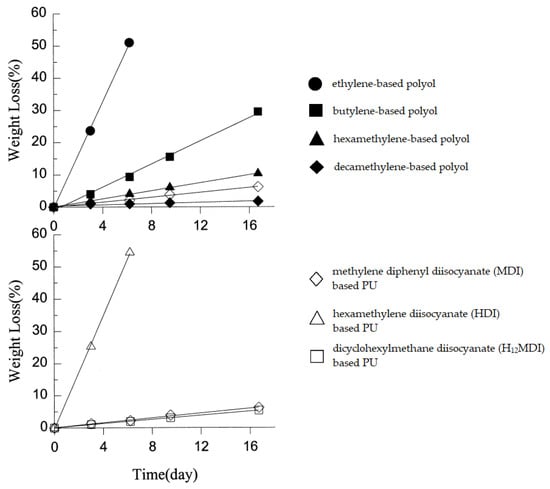 Influence of different substrates used for PUs synthesis on degradation rate in 10% NaOH solution at 37 °C. Upper graph: PUs obtained from polyols with different aliphatic segments. Lower graph: PUs obtained from different diisocyanates [23].