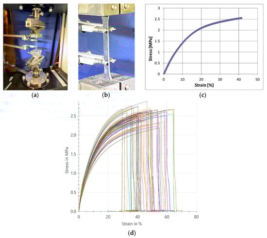 A sample prepared for the tensile test: (a) setup from a testing machine, (b) PS-polyurethane dog-bone specimen with long-travel extensometer, (c) non-linear stress-strain characteristic of a reference (I) specimen in the tensile test, (d) stress-strain characteristics range of all specimens (I-X) tested in tensile.