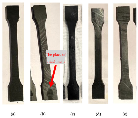 Representative samples with some visible effects on the surface compared to the unaged one. (a) reference (I), (b) weathering (II)—red arrow shows the place of attachment, which was covered from the sun radiation, (c) alkalis at 20 °C (V), (d) tap water (VIII), (e) frozen water (IX).