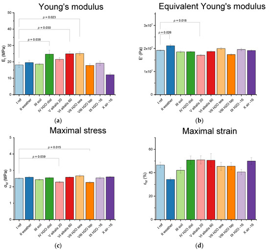 Results of Tukey test comparing mechanical properties—(a) Young’s modulus, (b) equivalent Young’s modulus, (c) maximal stress, (d) maximal strain, and (e) maximal work—of aged samples with references (cases with the recognized impact of corrosive factors marked with p-values).