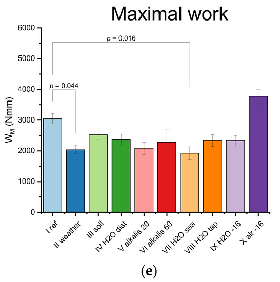 The influence of alkalis and aqueous environments is not obvious. E0 has increased for alkali at 60 °C (VI), but E’ has decreased for alkali at 20 °C (V), (Figure 6a,b). Moreover, alkali at 20 °C (V) showed lower σM when there was no such observation for the higher temperature (Figure 6c). E0 decrease was also observed for distilled water (IV) and seawater (VII). In addition, seawater showed significantly lower WM (Figure 6e), and tap water lower σM (Figure 6c). It is probable that the observed small changes in the mechanical properties are caused by leaching of mineral fillers, what generated precipitation in distilled water (IV) and alkalis at 20 °C and 60 °C, (V) and (VI) respectively. This may explain the differences in the influence of aqueous environments, as they had different ion types and concentrations.