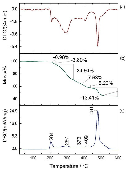 Figure 7 shows DTG, TGA, and DSC curves of the same sample from reference (I) (sample 1/6). According to the DSC result, no thermal effect was observed in any sample below 200 °C. In this temperature range, only a very small mass loss was observed (0.98% here, 0.89–1.71% other reference samples) that is probably due to absorbed water and other volatile substances evaporation. By the time temperature in the chamber reached 600 °C, the samples’ mass was reduced to 42–44% of the initial value. The loss occurred mainly in five stages, each with a corresponding DSC exothermic peak—the range of peaks correlated with the range of mass losses are shown in Table 1. This indicates the segmented structure of the polymer and staged thermal degradation with every stage related to different chemical group disintegration. First to decompose should be flexible segments followed by stiff ones, from which the latter effect should come from (at approx. 480 °C).