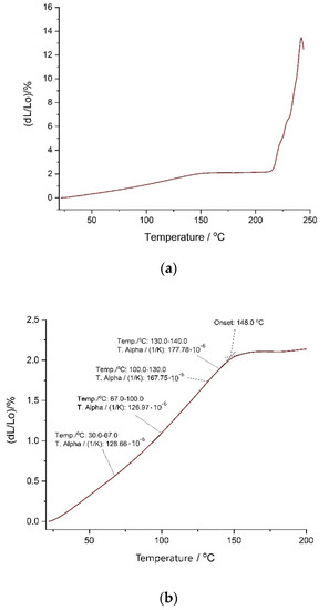 Figure 8 shows the dilatometric curve of sample 2 of reference (I) material. The experiment demonstrates a gradually increasing thermal expansion coefficient of the PS-polyurethane to the temperature around 140–150°C (onset for samples 1, 2, 3: 142.3, 148.4, 148.0, respectively). The value of the thermal expansion coefficient α for this material is about 0.00015 [1/°C] (Figure 8), which corresponds very well to the value α = 1.56e04 [1/°C] determined for Sika PS polyurethane using another testing method [37]. In the next temperature range up to 210°C, the curve flattens out, and subsequently measured thermal expansion is much lower—see close-up in Figure 8b. The material’s elongation is about 2% to the temperature of 210 °C. Then, at a temperature around 210–220 °C (onset for samples 1, 2, 3: 210.3, 217.3, 210.1, respectively), rapid expansion begins, as the material starts swelling until the curve reaches the peak (for samples 1, 2, 3: 229.0, 242.6, 236.8, respectively)—see close-up in Figure 8c. Then, the material becomes too soft so that the apparatus moving rod dips into it and measurement is no longer possible.