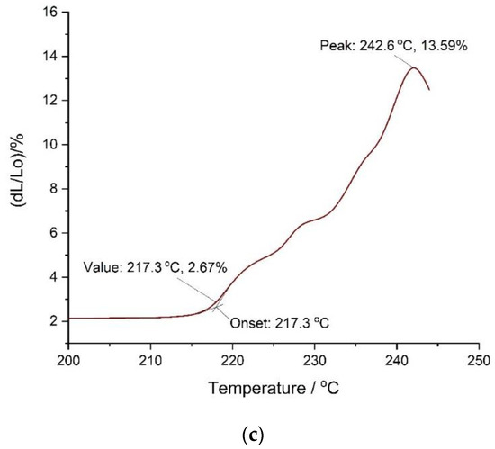 Polymer swelling followed by rapid softening (Figure 8c) is clearly correlated with the first exothermic effect observed during DSC measurement—it is the consequence of first stage degradation. More complicated is however the other effect (close-up in Figure 8b). The rapid change in the behavior suggests some kind of transition within the structure with no corresponding DSC peak (Figure 7a) observed. To explain the origin of this effect, further research is required, but it does not indicate the failure of mechanical properties.