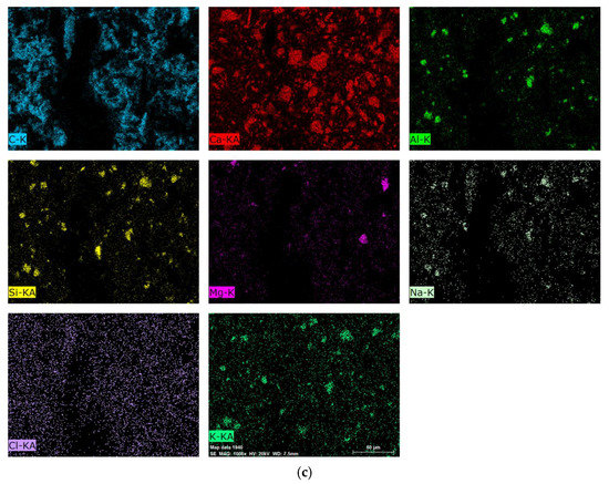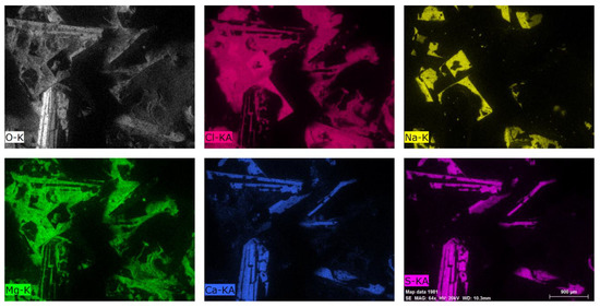 In the case of polymer samples aged in distilled water at 60 °C, the crystallized product on their surface (after partial evaporation of water) was also investigated in the same technique. The results of the microscopic examination of the formed crystals are shown in Figure 11. Eluted salts recrystallized in the case of distilled water as immersion fluid (Figure 5c). EDS analysis showed that the crystals consist of the same elements as were found on the polymer surface. As seen in Figure 11, they are gypsum (calcium sulfate), sodium chloride, magnesium chloride, and magnesium oxide. This also indicates that solid residue in alkalis at 20 °C (V) and 60 °C (VI) (Figure 5a,b) are at most the mixture of gypsum and recrystallized calcium hydroxide due to increased Ca2+ concentration. Different forms of precipitates probably have their origin in nucleation kinetics being influenced by temperature.