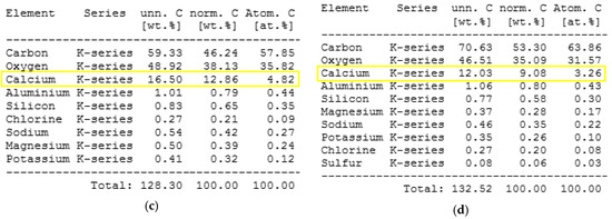 EDS surface analysis of (a) reference (I), (b) distilled water (IV), (c) alkalis at 60 (VI), (d) sea water (VII). The changes of calcium content on the surface have been marked with yellow boxes—decreasing values suggest elution of mineral fillers.