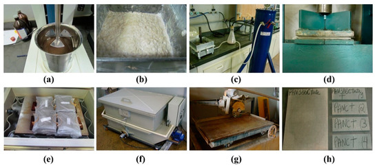 Schematic representation of the experimental setup of eucalyptus-basalt based hybrid reinforced cement composite (EB-HRCC) samples. (a) Mixing process. (b) Slurry tank. (c) Vacuum drainage. (d) Mechanical pressing. (e) Sealed bag samples (200 mm × 200 mm × 5 mm). (f) Thermal curing. (g) Water-cooled diamond saw cutter. (h) Samples for mechanical testing.