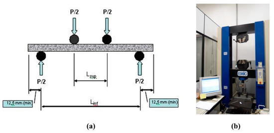 (a) Principles of the four-point bending test. (b) Universal mechanical testing machine.