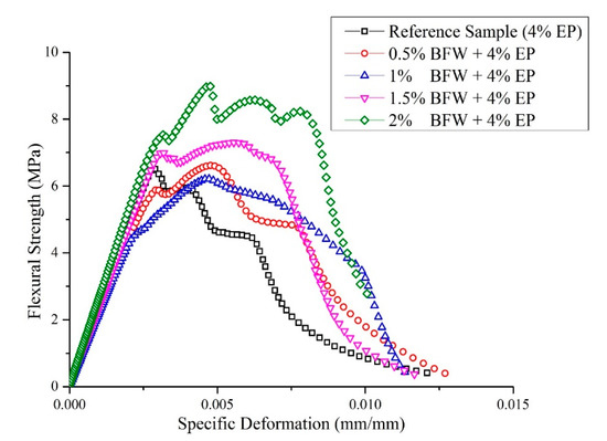 Typical flexural strength versus specific deformation curves for the reference sample (4% EP without basalt) and all the developed EB-HRCC samples after thermal curing for eight days are presented in Figure 4. The area under a curve represents the amount of energy absorbed by a composite sample. It was observed that the areas for composite samples made with 2% BFW and 4% EP were significantly higher than those of all other developed samples with less BFW, including the reference sample. The results showed strain hardening behavior of all samples with an increase in flexural stress after the first cracking point. The first cracking point is also known as the limit of proportionality (LOP). It was also observed that samples with formulation (2% BFW + 4% EP) exhibited higher ultimate resistance and deformation capacity. Maximum stress redistribution after the first cracking point was observed for samples with formulation (2% BFW + 4% EP). This sample showed a deflection hardening response with a displacement of 0.0047 mm followed by deflection softening response. It could be possible that after LOP, a part of composite sample with formulation (2% BFW + 4% EP) in the elastic region reinitiated by transfer of forces from the matrix to the fibers and finally showed ductile behavior rather than brittle behavior. Toughness was increased with the addition of BFW. The fibers adhered very well to cement matrix and filled the air gaps inside the matrix. The reference sample exhibited lower toughness than all EB-HRCC samples. This shows that a higher proportion of BFW in the cement matrix played a significant role in enhancing mechanical properties. The results are in agreement with the findings of Correia et al. [41].