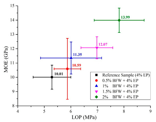 From a different perspective, mechanical properties were also discussed in detail in a comparative analysis of LOP and SE against MOE and MOR, respectively, as presented in Figure 5 and Figure 6. It was observed that composite samples developed with formulation (2% BFW + 4% EP) exhibited higher values of LOP even after 8 days of thermal curing (Figure 5). The results showed that refinement softens the internal fiber structure and increases flexibility, which allows the fiber to wrap around the cement matrix or around other minerals present in the slurry and makes intimate contact with particles, binding them together tightly and providing a more densely packed composite sample. It was also observed that bleaching process changes the outer fiber surface and exposes the micro-fibril with a rough interface, and makes permeability easy in order to remove extracts and amorphous lignin. Consequently, the interfacial bonding between bleached fibers and cement was improved. Similar results were observed by Tonoli et al. [14]. The results demonstrated that composite samples with higher percentages of BFW show excellent values of MOE and MOR, better than all other samples having low percentages of BFW, including the reference sample (without BFW). It was observed that the average SE results are similar for composite samples with 0.5%, 1% and 1.5% BFW. However, composite samples with 2% BFW showed the maximum SE value to break the bonding, and the reference sample showed the minimum SE value (Figure 6). The results indicated much better adhesion and closed structural packing between the reinforcement agents (BFW and EP) and the cement matrix. The results showed that MOR values (strength effectiveness) for all composite samples at 0.5%, 1.0%, 1.5% and 2.0% volume fractions of BFW (Figure 6) were 5%, 6.2%, 17.6% and 39.1% higher than the reference sample (without BFW).