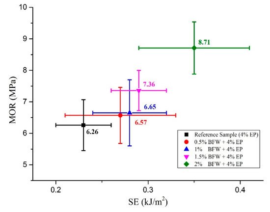 Correlations between SE and MOR of all composite samples with their standard deviations.
