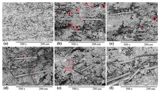 SEM analysis of EB-HRCC samples: (a) reference sample (without BFW), (b) 0.5% BFW + 4% eucalyptus pulp (EP), (c) 1% BFW + 4% EP, (d) 1.5% BFW + 4% EP, (e,f) 2% BFW + 4% EP from different samples respectively.