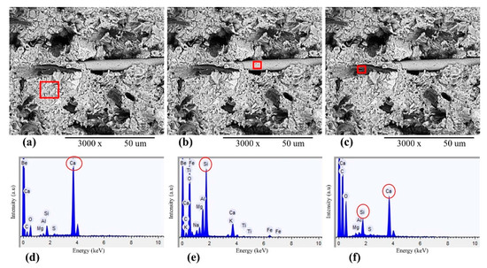 EDX analysis of EB-HRCC samples. (a,d) Energy spectra of cement paste taken from red rectangular part and confirmed the presence of Ca. (b,e) Energy spectra of fibrous basalt taken from rectangular part and confirmed the presence of Si. (c,f) Energy spectra of EP taken from rectangular part and confirmed the presence of Ca and Si respectively.