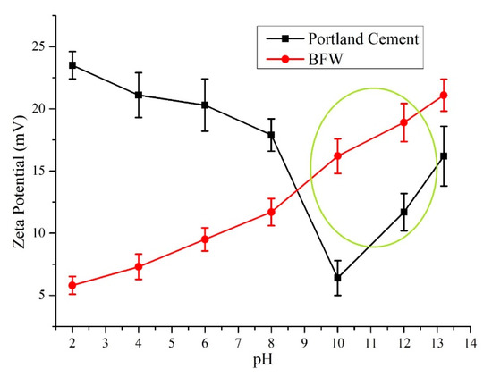 Zeta potential is a noteworthy parameter for controlling the surface charges of particles in a suspension. Zeta potential values as a function of pH contribute to recognizing the interaction between cement and BFW. A pH value between 11 to 12 is of great interest, as the hydration interval occurs in this range between cement and a fiber reinforcement agent. Zeta potential measurements were performed as a function of pH change through a zeta meter. In a typical experiment, samples were added to a 100 mL KCl (used as an electrolyte) solution; 1 M KOH and 1 M HCl were used as reagents for pH variation. The results of zeta potential for BFW and Portland cement are shown in Figure 12. It was observed that zeta potential values for Portland cement and BFW were positive in the proposed pH range, as a sudden increase in the trend (zeta potential value) was observed that showed a positive attraction of electrostatic charges between Portland cement and BFW. This electrostatic attraction present between the matrix of Portland cement and BFW increases the synergy for fiber–cement composites, especially when the particles are stable inside the matrix. The results show that for zeta potential values above 8 mV, the Portland cement matrix and BFW are significantly stable in the slurry. The fiber–cement interaction with their strong attraction removes spacing between the matrix, which lowers the overall porosity of the fiber–cement matrix and results an increase in mechanical properties. The obtained results are supported by the theoretical findings of Junior and Baldo [43].
