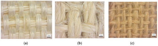 Ixtle and Henequen yarn fibers with thread counts of 30 and 35 were purchased to Cordeleria Santa Ines, Yucatan, Mexico. The yarn’s average length was 2000 m and was rolled on a reel for the following weaving steps. Both natural fibers were woven in a plain weave configuration by Mexican artisans from Queretaro’s state in Mexico. Henequen and Ixtle fibers have an elastic modulus of 13 and 27 GPa, a tensile strength of 13 and 18 MPa (ASTM C1557), and a density of 1.12−and 1.02 g/cm3 (ASTM D3822), respectively. According to the supplier, mechanical extraction is the process used to extract the Henequen fibers, and it promotes long fibers with a rough surface, and the maceration process is used to extract the Ixtle fibers and conducts to a smooth surface.