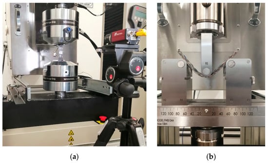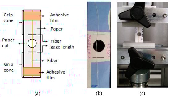 Bangladesh Jute fiber of 12 mm yarn with a thread count of 70 threads was imported by Bolsas Publicitarias, Cuernavaca, Morelos, Mexico in a plain wave configuration. Jute fibers have an elastic modulus of 67 GPa, a tensile strength of 45 MPa (ASTM C1557), and a density of 1.23 g/cm3 (ASTM D3822). It is well documented that cellulose influences plant fibers’ mechanical properties, hemicellulose is related to biodegradability, and lignin provides thermostability to the fibers []. Table 1 presents more technical data obtained from experimental results previously performed in our laboratory and literature. We calculated the mechanical properties of natural plant fibers used in this work using one thread from the natural-fiber yarns. The specimen test setup is shown in Figure 2. We tested three different gauge lengths of fibers of 20, 30, and 40 mm at room temperature (23 °C ± 1 °C) and a crosshead speed of 2 mm/min in an MTS Series 647 universal testing machine (MTS Systems Corporation, Eden Prairie, MN, USA) equipped with hydraulic wedge grips and a load cell of 1 kN. The experimental test comprised five repetitions for each gauge length.