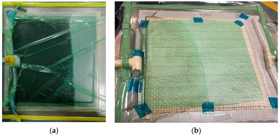 Photographs of manufacturing infusion impregnation process corresponding to: (a) vacuum-assisted resin infusion (VARI) with the epoxidized vegetable oil (EVO) biobased epoxy resin, (b) VARI with the Sicomin Resin SR GreenPoxy 56 (GP) biobased resin.
