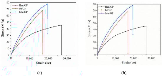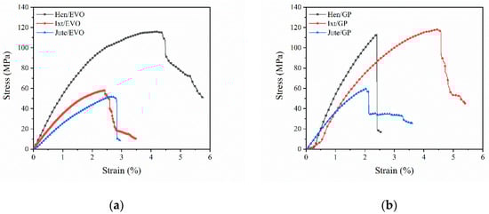 Representative tensile stress vs. strain curves for the natural-fiber-reinforced biobased resins: (a) biolaminates with the EVO resin; (b) biolaminates with the GP resin.