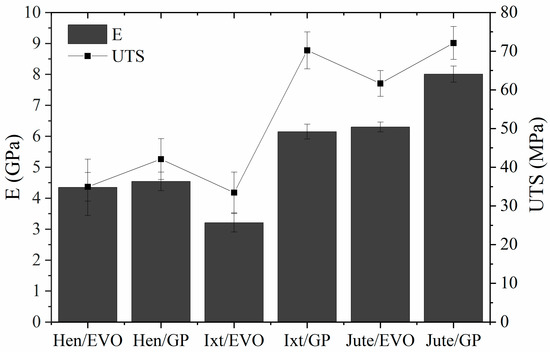 Regarding composites using the GP bioresin, the differences in tensile properties related to the intrinsic properties of the natural fiber did not show significant trends. Hen/GP was the biolaminate with the lowest tensile parameters, whereas the strength and maximum load of the Jute/GP and Ixt/GP biocomposites were similar, and Jute/GP was the biolaminate with significant stiffness. The results suggest that the Ixtle and Jute fibers are more compatible with the GP bioresin than Henequen and provide better stress transfer mechanisms. Various parameters influence the mechanical properties of fiber-reinforced composites including the fiber orientations, fiber–matrix adhesion, stress transfer at the interface, and fraction volume of fiber density. Jute/GP biolaminates combine the best parameters to obtain high tensile mechanical properties: (i) high fabric closure factor (porous and gaps between yarns are small), (ii) high fiber volume fraction, (iii) low-viscosity resin with good impregnation, and (iv) good wettability, resulting in a remarkable bonding interface between the fiber and resin.