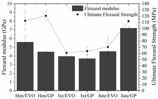 The representative stress–strain curves for the Ixtle, Henequen, and Jute fibers impregnated with bioepoxy resins EVO and GP under bending are presented in Figure 8. The bending parameters, such as flexural modulus and ultimate flexural strength, are compared in Figure 9.