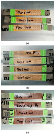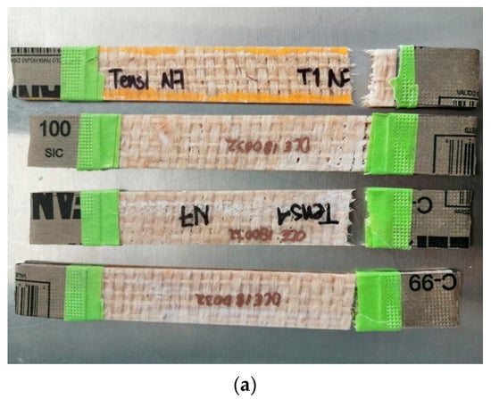 Photographs corresponding to the failure modes in tension for: (a) Hen/EVO, (b) Ixt/EVO, (c) Jute/EVO biolaminates.