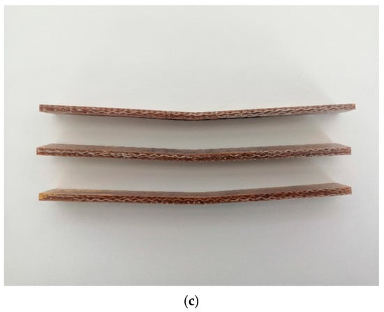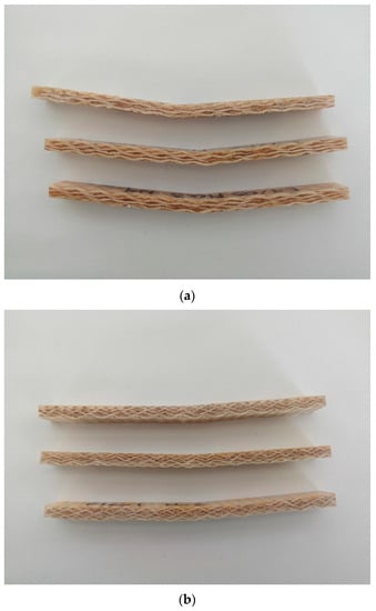 Similar to the failure explanation in the tensile mode, the failure of biolaminates after the flexural test was also evaluated. This examination was useful to classify their primary failure mode. The deflection typically occurred at the middle of the biolaminates, which was in contact with the machine head, considered to be a loaded edge. The deflection typically occurred in the middle of the laminates, which was in contact with the machine head, therefore considered to be a loaded edge. The loading produces the maximum bending stress by deflecting the laminate and even fracture of the laminate’s outer fibers under excessive loading. In our case, the fibers did not break during the tests.