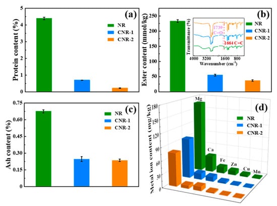 The change of non-rubber components, including protein, ester, ash content, and metal ions, in NR is investigated before and after centrifugation, as shown in Figure 1. It is observed that all non-rubber components apparently decrease after treatment with centrifugation. As depicted in Figure 1a, compared with NR (4.3932%), the protein content of CNR-1 and CNR-2 is dramatically decreased to 0.7007% and 0.2237%, respectively, indicating that the protein in NR is removable through centrifugation. To accurately quantify the content of ester in NR, CNR-1, and CNR-2, the intensity ratio of carbonyl group to unsaturated carbon was assessed by FTIR (as shown in inserted Figure 1b). The content of ester in NR remarkably decreases to 54.84 mmol/kg (CNR-1) after once centrifugation, and further decreases to 36.55 mmol/kg (CNR-2) followed by double centrifugation. Ash content is measured to provide the information about the inorganic salt (phosphate or sulfate of potassium, calcium, magnesium, aluminum, copper, and other metallic elements) content of the prepared samples. From Figure 1c, the ash content is calculated to be 0.6755% (NR), 0.2473% (CNR-1), and 0.2364% (CNR-2), respectively, indicating that the inorganic salt in NR was removed by centrifugation. Furthermore, the result in Figure 1d confirms that the decrease in ash content is attributed the metal ions removal, especially Mg2+ and Ca2+. Besides, it is noted that the color of samples gradually become shallow as the centrifugation number increases (Figure S1), which, along with the above results, verifies the removal of non-rubber components in NR. The above analyses illustrate that the centrifugation treatment is a valid approach to remove the non-rubber components in NR, and the resultant content of non-rubber components in NR depends on the centrifugation number.