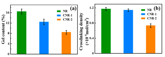 To further investigate the impact of non-rubber components on the network of NR, the gel content and crosslinking density (Figure 2) were examined. After centrifugation, the gel content of CNR-1 (12.39%) and CNR-2 (12.39%) is obviously less than that of NR (16.39%). Simultaneously, compared with NR (1.17 × 10−4 mol/cm3), the crosslinking density of CNR-1 and CNR-2 is decreased to 1.14 × 10−4 mol/cm3 and 0.73 × 10−4 mol/cm3, respectively. The above results clearly reveal that the gel content and crosslinking density could be significantly affected by the non-rubber components, which might be due to the decomposition of crosslinking points originating from non-rubber components, such as protein, phospholipids, and metal ions. Moreover, the variation of gel content and crosslinking density is correlated to the network structure in NR. Consequently, it concludes that the non-rubber components play an important role in the construction of network structure in NR.