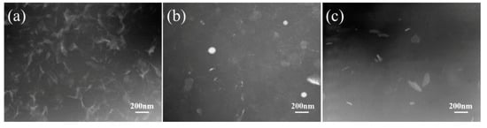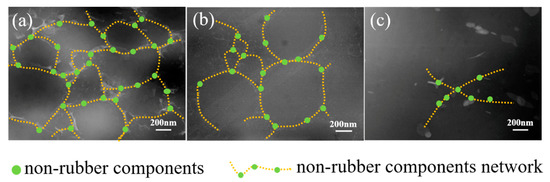 The dispersion of non-rubber components in the rubber matrix and the variation of network are characterized by STEM (Figure 3). According to the STEM observation, phase-separated structure is found for NR and CNR, in which bright domains represent non-rubber components and gloomy domains represent molecular chain. It is clearly seen that non-rubber components distribute uniformly in the NR matrix (Figure 3a–c). Besides, the network induced by non-rubber components is observed due to intrinsic ionic bonds and H-bonding among non-rubber components [2,36,37,38,39,40,41,42]. However, the content of non-rubber components decreases significantly after centrifugation, which results in the decomposition of network (Figure 3b,c). Therefore, the existence of non-rubber components in rubber is crucial for the network formation.