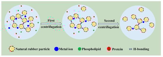 On the basis of analyses mentioned above, we tentatively proposed a novel model for natural network structure of NR, as illustrated in Figure 4. NR molecules chains comprise of long-chain isoprene units, as well postulated that α-terminal links with mono- or di-phosphate groups that associate with phospholipids, whereas the ω-terminal is a dimethylallyl group that interacts with proteins [12,43,44,45]. Meanwhile, these molecules chains could interact with each other via their terminal groups. Namely, phospholipids are linked to another phospholipid molecular in other chain ends via H-bonding or ionic bonds derived from metal ions, whereas proteins could interact with other protein molecules through H-bonding and metal ions. Moreover, proteins, phospholipids, and metal ions in NR can function as crosslinking points, inducing crosslinking network formation in terminal groups (terminal crosslinking). Notably, the hydrogen bond and ionic bond are vulnerable to breakage under centrifugation, as evidenced by the decrease of metal ion content (e.g., Ca2+ and Mg2+). The decrease is also responsible for the change in gel content and crosslinking density after centrifugation (Figure 2). Additionally, entanglements, which can function as crosslinking points, are a key component of natural network [39,46,47,48,49].