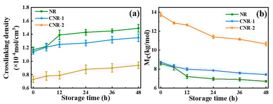 In order to assess the effect of non-rubber components on network structure of NR during accelerated storage, the accelerated storage hardening test was carried out. As reflected by the Figure S2, the variation of the Mooney viscosity and P0 for both NR and CNR determines the occurrence of storage hardening. Furthermore, Figure 5a,b describe the change in crosslinking density and the average molecular weight between crosslinking (Mc) of NR, CNR during accelerated storage. An increase in crosslinking density for all samples is obtained during accelerated storage, which might be result of the molecular crosslinking. Nevertheless, after accelerated storage for 48 h, the CNR-1 (1.35 × 10−4 mol/cm3) and CNR-2 (0.94 × 10−4 mol/cm3) exhibit a lower crosslinking density compared with NR as received with the crosslinking density of 1.49 × 10−4 mol/cm3, suggesting the decrease of non-rubber components is hardly conducive to the formation of network structure during accelerated storage. The changing trend of Mc for NR, CNR-1, and CNR-2 in Figure 5b is in good accordance with the variation of crosslinking density, which further supports the conclusion that the non-rubber components are important in the formation of network structure during accelerated storage.