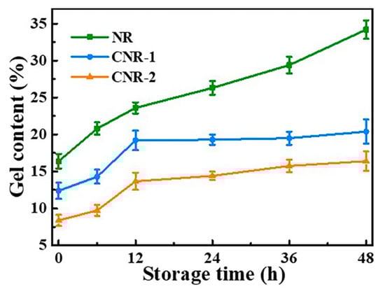 Furthermore, gel content can reflect the degree of crosslinking of regional network molecules of NR samples from a macroscopic perspective [50]. The change in the gel content of NR, CNR-1, and CNR-2 during accelerated storage is evaluated and the result is displayed in Figure 6. At initial storage stage (≤12 h), the gel content of all samples gradually increases over time, which is explained by the increase in network density. When the storage time is further extended, unlike the NR, there is no significant change in gel content of CNR-1 and CNR-2. It is noted that NR has the maximum gel content and the highest crosslinking degree before and after accelerated storage, which is ascribed to that NR possesses abundant protein, ester, and metal ions (Figure 1). The results suggest that the terminals crosslinking arising from non-rubber components facilitate the gel formation.