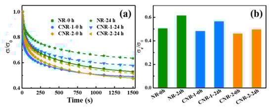 The Maxwell fit result of σe/σ0 is displayed in Figure 7b. Due to the existence of network, the movement of rubber molecular chain is limited, resulting in a greater stress and a longer time to reach equilibrium. As a result, residual stress decreases in this order: NR-24 h > CNR-1-24 h > CNR-2-24 h, NR-0 h> CNR-1-0 h > CNR-2-0 h. Moreover, compared with the σe/σ0 before accelerated storage, the σe/σ0 of all samples higher after accelerated storage. Notably, NR-24 h displays the largest σe/σ0 and longest stress relaxation time, which is proportional to crosslinking density; therefore, NR-24 h has the largest crosslinking density, which is consistent with the results of Figure 5.
