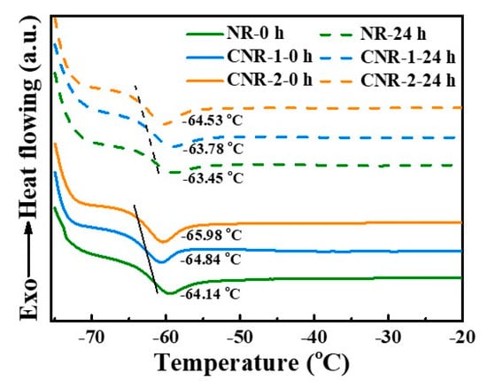The difference in network further influences the glass transition temperature (Tg) during accelerated storage. As shown in Figure 9, the Tg of NR, CNR-1 and CNR-2 before and after accelerated storage is measured and the results are shown in Figure 9. Compared with samples before accelerated storage, a increase in Tg is observed for all samples after accelerated storage, attributing that the increase in network density restricts the slip of molecular chain. Nevertheless, it is worth mentioning that the NR-24 h exhibits the highest Tg value (−63.45 °C) in comparison with CNR-1-24 h (−63.78 °C) and CNR-2-24 h (−64.53 °C), illustrating that the terminal crosslinking derived from non-rubber components have noticeable impact on the slip of molecular chain during accelerated storage. As a consequence, we speculate the terminal crosslinking and the state of entanglement significantly influence the slip of molecular chain, and, subsequently, the network structure during accelerated storage.