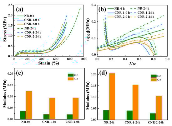 However, we still cannot distinguish the contribution of the terminal crosslinking and that of the entanglements to the network structure during accelerated storage. To address this problem, the stress-strain curves are first studied, they can reflect the raw NR resisting deformation and fracture when the samples are stretched. As displayed in Figure 10a, an obvious increase in stress after accelerated storage for NR, CNR-1, and CNR-2 is observed, ascribed to the increase of crosslinking density (Figure 5) during accelerated storage. Meanwhile, the NR exhibits a higher stress in comparison with CNR-1 and CNR-2 after accelerated storage. This can be explained by the fact that the existence of plentiful terminal crosslinking induced by non-rubber components and entanglements constrains the network to relax and eliminates to some extent the stress to resist deformation and fracture. The result provides another support for the above speculation that the network structure can be significantly affected by terminal crosslinking and entanglements during accelerated storage. Furthermore, the stress-strain curves are analyzed according to the tube model, which assumes an additive contribution of chemical cross-links and the entanglement [54]. Therefore, the tube model can distinguish the contribution of the terminal crosslinking and entanglements on the network by the Mooney-Rivlin (MR) law. Moreover, the tube mode is often used to describe the nonlinear elastic response of stretched polymer. Since the NR, CNR-1, and CNR-2 exhibit strongly nonlinear stress-strain relations (Figure 10a), the tube model is more suitably used to describe the elastic behaviors [27]. The reduced Mooney stress is written in the form: