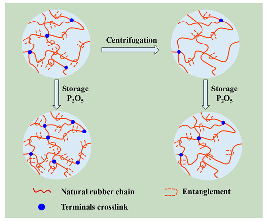 A storage hardening mechanism based on the obtained results can be proposed (Figure 11). The non-rubber components, such as protein, phospholipid, and metal ions, affect the contributions of the terminals and the entanglements on the network structure and further impact the occurrence storage hardening. Nevertheless, although both the terminal crosslinking and entanglement are increased after accelerated storage, the entanglement dominates the formation of network during accelerated storage.
