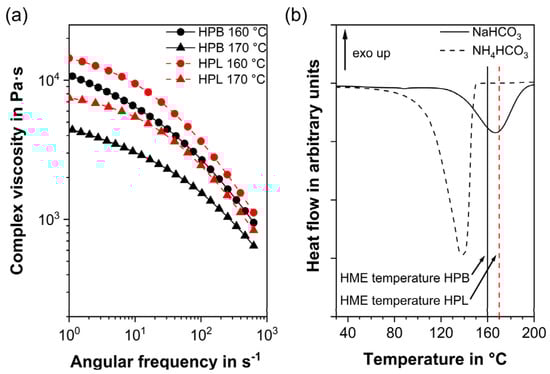 The melt viscosity of HPB at 160 °C was very similar to that of HPL at 170 °C, particularly at higher angular frequencies that reflected the shear condition in a twin-screw extruder. Only at these temperatures, the polymers also show a complex viscosity between 103 and 104 Pa·s, which is recommended for adequate mixing and to avoid exceeding torque limits during the HME process []. Therefore, and in order to process both polymers at comparable rheological conditions, 160 and 170 °C were chosen as the processing temperatures for HPB and HPL, respectively. To avoid further influencing parameters, the screw speed was kept constant at 40 rpm. Additional adaptations of the HME process, such as the screw configuration, screw fill level and feed rate and their effect on porous extrudates will be the subject of subsequent studies.
