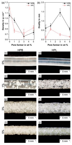 Figure 2 shows the apparent density, ovality and macroscopic images of extrudates comprising either HPB or HPL without and with NaHCO3 as PF. Compared to the pure TPUs, the addition of NaHCO3 resulted in a significant reduction in density at all observed PF concentrations for both HPB and HPL (p < 0.05; Figure 2a). For HPB, the density followed a linear decrease with increasing PF content up to 3 wt% NaHCO3 (ρHPB = 1.06 ± 0.03 g·cm−3, ρHPB/NaHCO3-1 = 0.96 ± 0.04 g·cm−3 and ρHPB/NaHCO3-3 = 0.66 ± 0.04 g·cm−3). Macroscopically, the same trend toward a more porous structure for increasing PFs was observed (Figure 2c,e,g). The addition of 1 wt% NaHCO3 resulted in few, distinctly separated and mainly closed pores (Figure 2e), whereas HPB/NaHCO3-3 formed a dense porous network (Figure 2g). Interestingly, a further increase in PF concentration to 5 wt% resulted in an insignificant increase in density (ρHPB/NaHCO3-5 = 0.74 ± 0.04 g·cm−3; p > 0.05) and similar macroscopic appearance compared to HPB/NaHCO3-3 (Figure 2g versus Figure 2i).