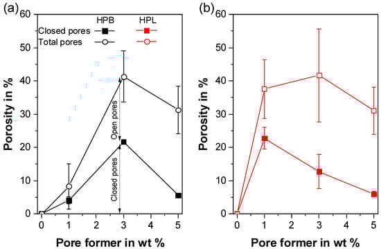 Total porosity and porosities derived from open and closed-cell pores respectively for all formulations comprising (a) hydrophobic (HPB) and (b) hydrophilic thermoplastic polyurethane (HPL) with and without NaHCO3 as pore former. The lines serve for optical guidance only.