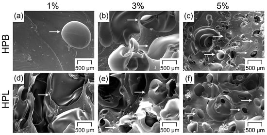 Scanning electron microscopy (SEM) images of the cryofractured surface of the extrudates as a function of the pore former concentration for (a–c) hydrophobic (HPB) and (d–f) hydrophilic thermoplastic polyurethane (HPL). The white arrows mark the introduced pores.