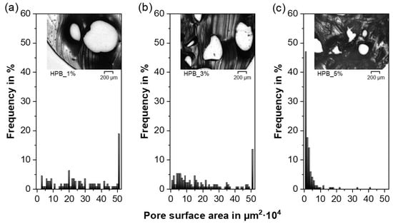 Moreover, the pore surface area distribution became narrower with increasing PF concentration, ranging from a heterogeneous pore size for 1 wt% PF content (Figure 5a and Figure 6a) to a more homogeneous small pore size for high PF concentrations (Figure 5c and Figure 6c) []. These findings suggest that the pore size could be further reduced and homogenized if higher PF concentrations than 5 wt% were employed.