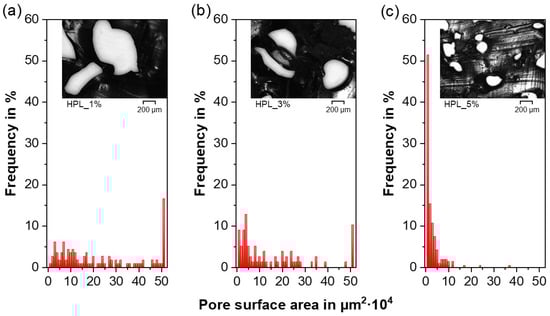 Similar to the HPB extrudates, both HPL/NaHCO3-1 and HPL/NaHCO3-3 revealed rather high standard deviations for the porosity (Figure 3) and a wide pore size distribution. Hence, the standard deviations in the liquid uptake studies were also rather high (13% and 14%, respectively). Same as for HPB/NaHCO3-5, due to the more homogenous pore size distribution and smaller average pore size, HPL/NaHCO3-5 shows less fluctuations in terms of porosity (Figure 3), a narrow pore surface area distribution (Figure 6) and thus a low relative standard deviation (5%) with regard to liquid uptake. It should be noted that the high deviations in liquid absorption could also be partially caused by the measurement setup itself, especially in the case of large-pored samples (i.e., HPL/NaHCO3-1 and HPL/NaHCO3-3). These pores may not have adequately trapped the water when the sample was wiped with a paper towel, so that some of the water was removed.