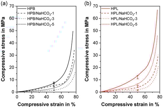 Representative compressive stress–strain curves for the formulations comprising (a) hydrophobic (HPB) and (b) hydrophilic thermoplastic polyurethane (HPL) with and without NaHCO3 as the pore former. The confidence interval for a significance level of 5% for the compressive stress at 50% compressive strain (σ50) is marked by error bars.