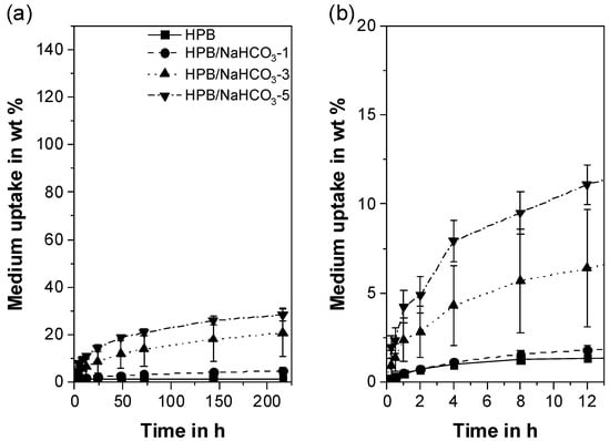 In addition to the open-cell pores, the width of the pore size distribution and, therefore, the mean pore size diameter influenced the results. This can be discerned from the high standard deviations of the liquid uptake of HPB/NaHCO3-3 (Figure 8b) owing to the broad pore size distribution (Figure 5b, Table 2). A large interconnected pore of HPB/NaHCO3-3 will confine higher amounts of medium compared to the limited open-cell pores of HPB/NaHCO3-1. Although HPB/NaHCO3-5 exhibited the smallest and most homogeneous pores (Figure 5c), it still absorbed the highest quantity of medium (Figure 8b). This finding proves that for the hydrophobic TPU used in this study, a high percentage of open-cell pores was more decisive than the pore size.