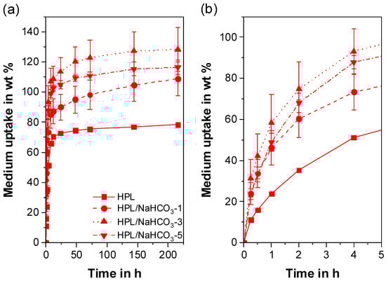 All formulations comprising HPL (Figure 9a) exhibited a significantly higher and faster liquid uptake than HPB. The liquid uptake of pure HPL reached the plateau already after 24 h at 74.4 ± 0.4 wt%. In contrast to HPB, the liquid uptake of the porous formulations was mainly influenced by the total porosity and not by the number of open-cell pores. This can be explained on the one hand by the fact that the diffusion of the hydrophilic medium into the hydrophilic polymer is promoted and, thus, much faster [,]. On the other hand, the liquid absorption can be further increased by a higher total porosity []. All porous HPL formulations show a higher liquid absorption than pure HPL. In addition, when the liquid uptake plateau was reached, no significant differences between the porous HPL formulations were observed (p >> 0.05; Figure 9b). This finding can be attributed to the similar overall porosities obtained for all three formulations (Figure 3).